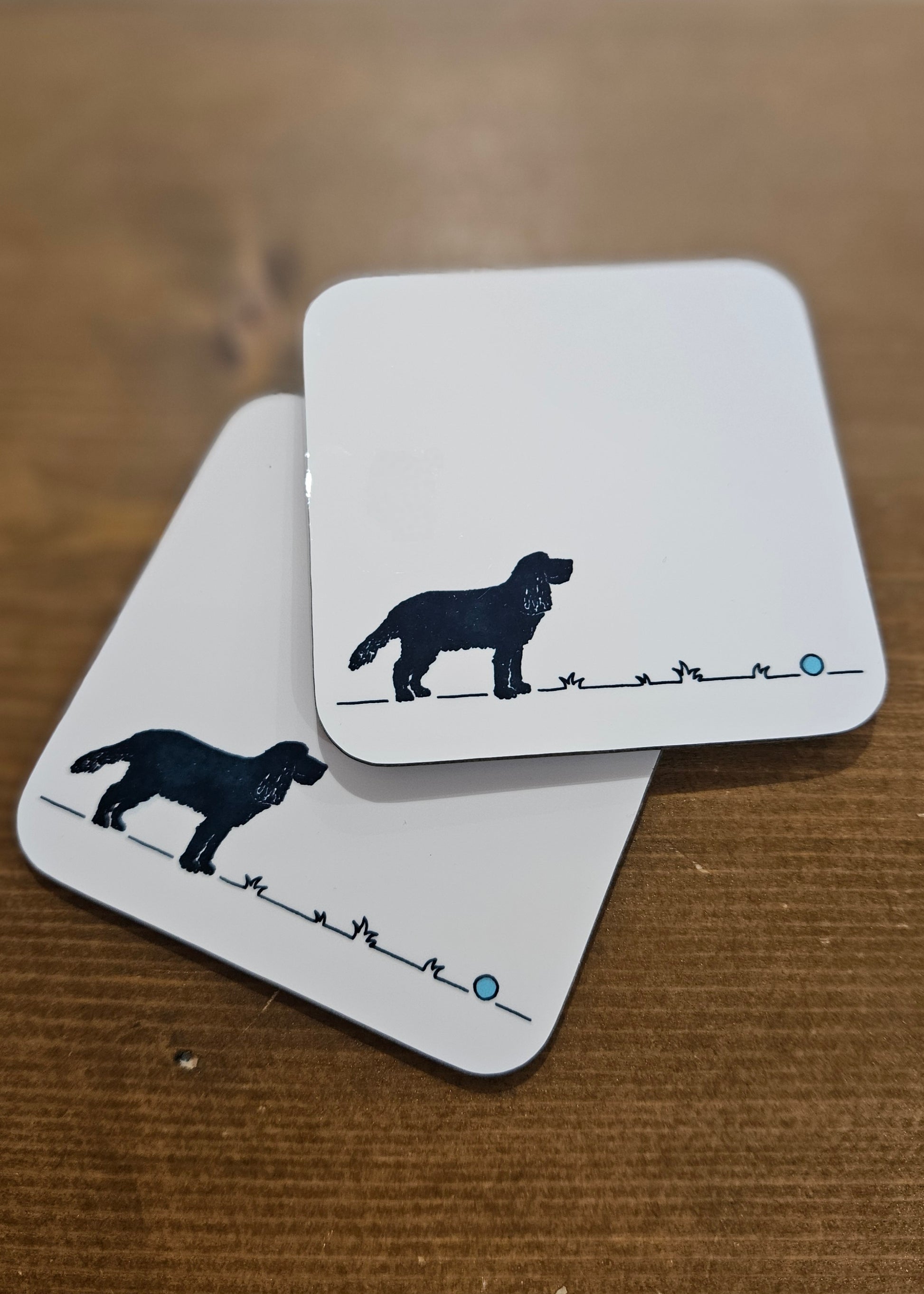 Coasters featuring the new Cocker Spaniel 'go fetch...' design by local artist, Jackie Roberts.