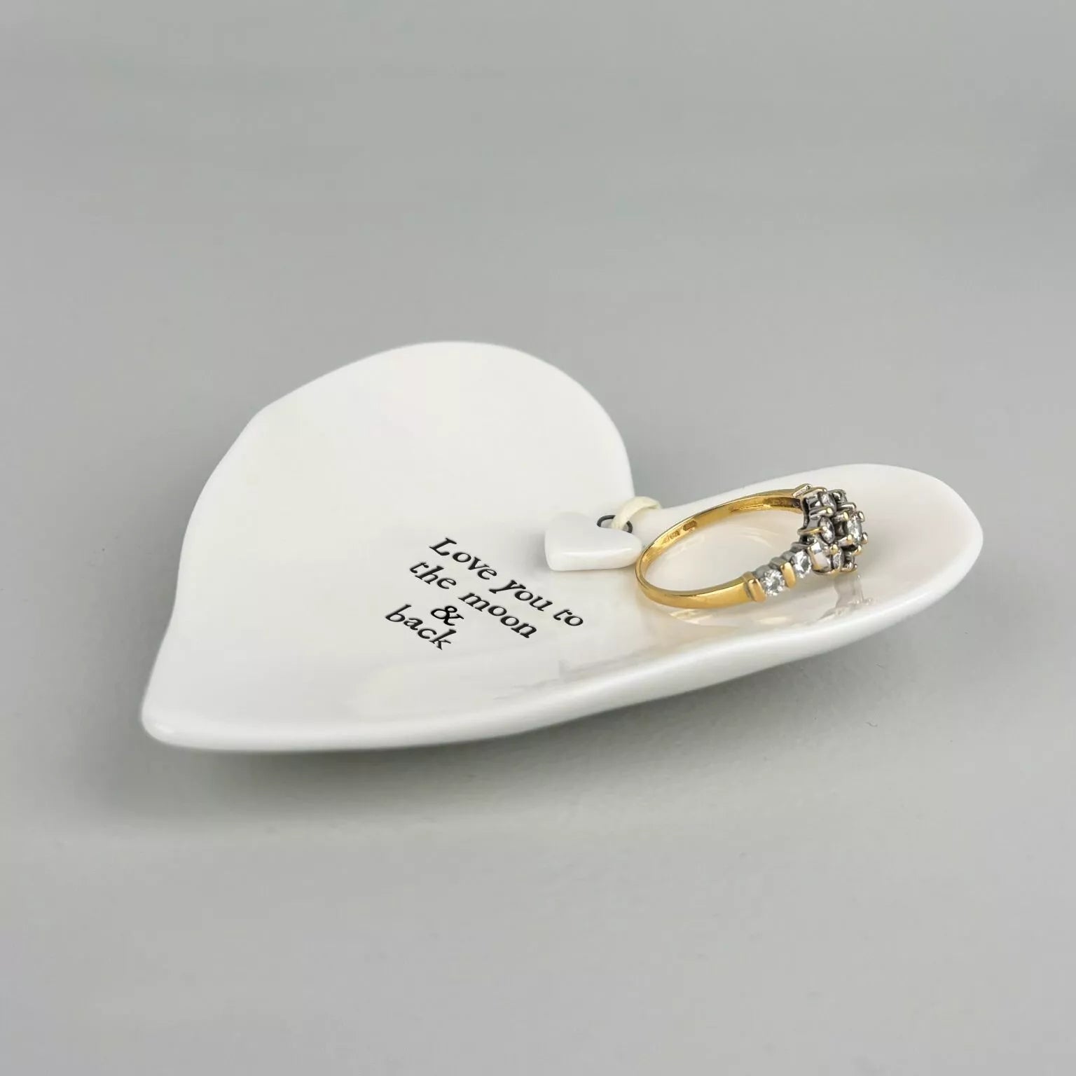 The white porcelain dish is shaped like a heart and features a small hanging heart at the top of the design. Perfect for holding small bits of jewellery such as rings or earrings, this dish also features text which reads ‘Love you to the moon and back’.