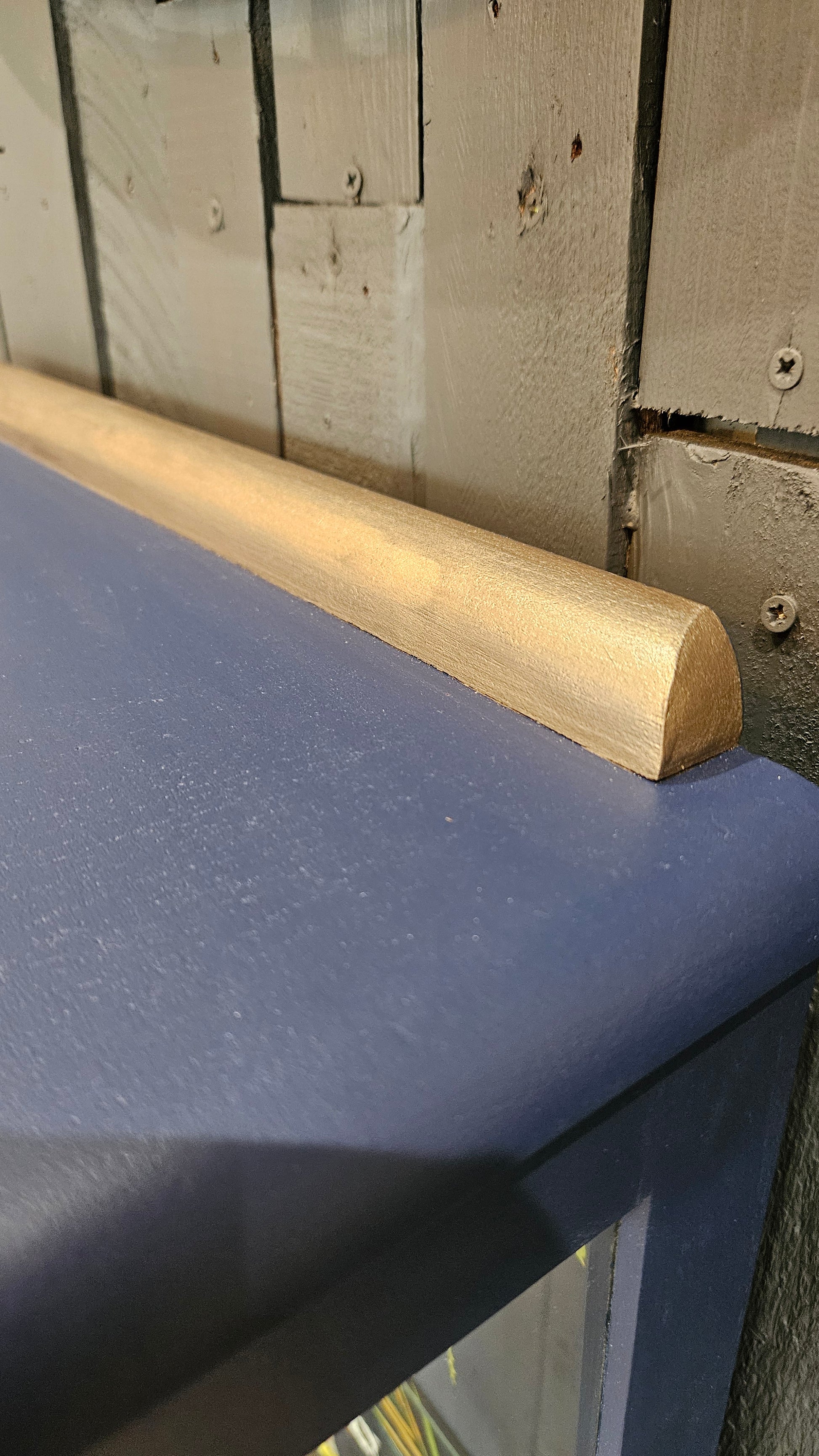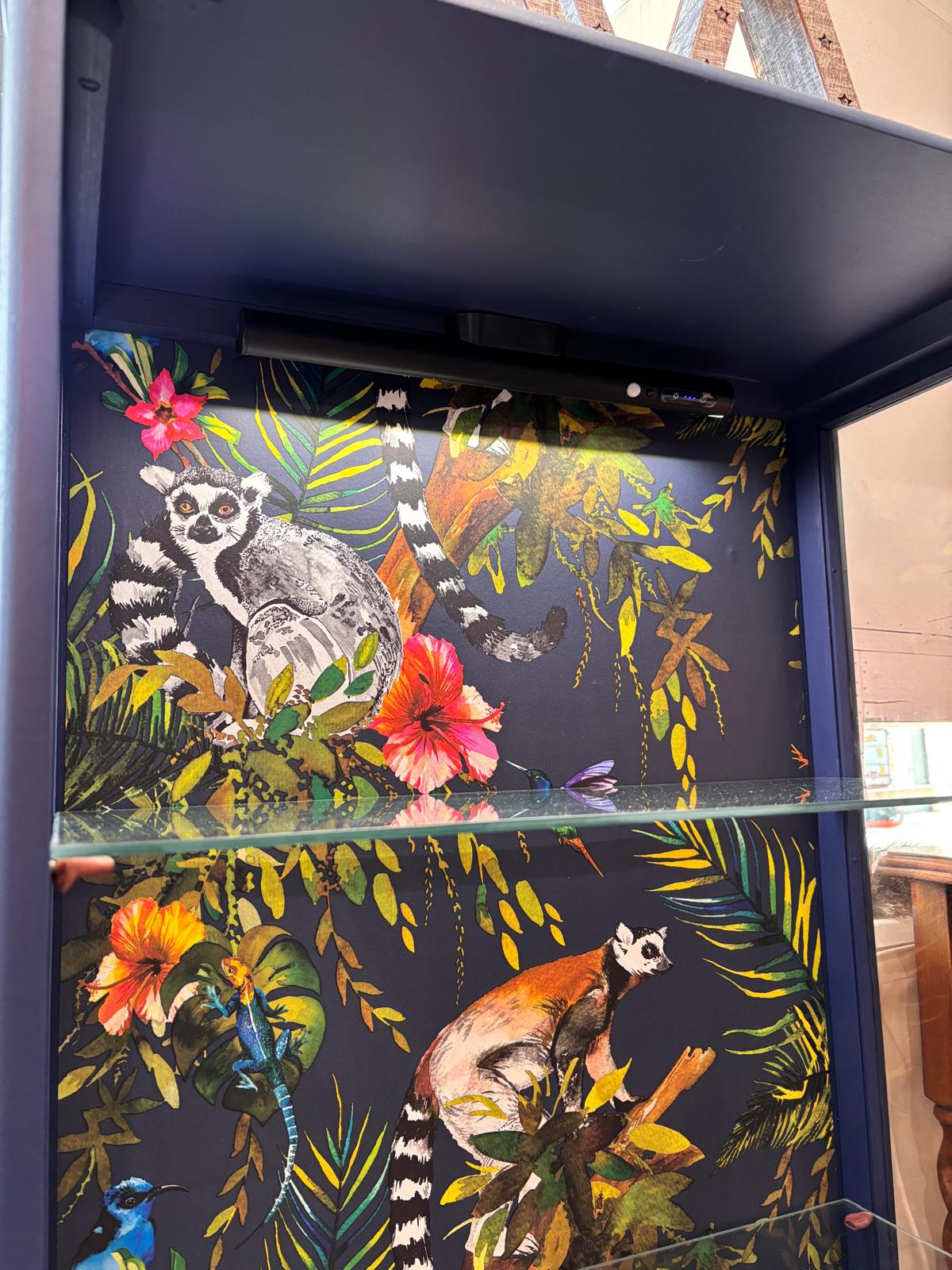 A beautifully restored hand painted drinks cabinet, finished in Frenchic Hornblower with Golden Oldie Frenshimmer feet. The interior features striking Lema wallpaper and glass shelves to showcase bottles and glassware.