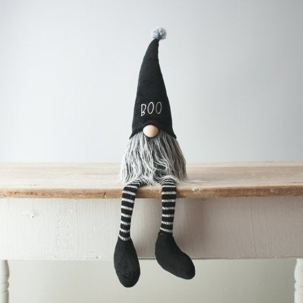 A fun halloween sitting gonk, featuring a tall black hat, with 'boo' embossed wording, a grey fuzzy beard and monochrome striped legs.