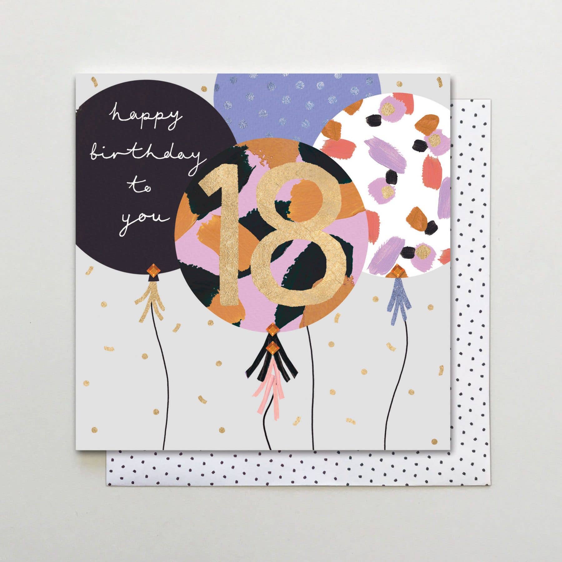 175 x 175 mm polka dot envelope with address box Printed on luxury ethically sourced card. Foiled and hand finished with sparkly gems. Blank inside for your own message.